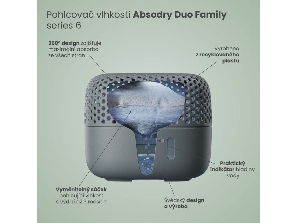 Absodry Duo Family je vyroben z recyklovaného plastu. Švédská společnost Everbrand je moderní firmou se silným enviromentálním přístupem k životnímu prostředí. A pokud zbavíte vaši domácnost vlhkosti a nepříjemných plísní, je to přesně ten stav, který si firma dala jako svůj cíl.