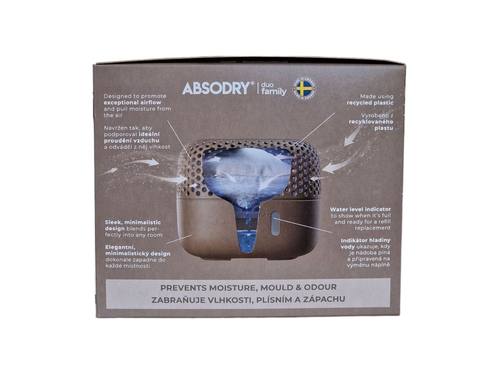 Absodry Duo Family je vyroben z recyklovaného plastu. Švédská společnost Everbrand je moderní firmou se silným enviromentálním přístupem k životnímu prostředí. A pokud zbavíte vaši domácnost vlhkosti a nepříjemných plísní, je to přesně ten stav, který si firma dala jako svůj cíl.
