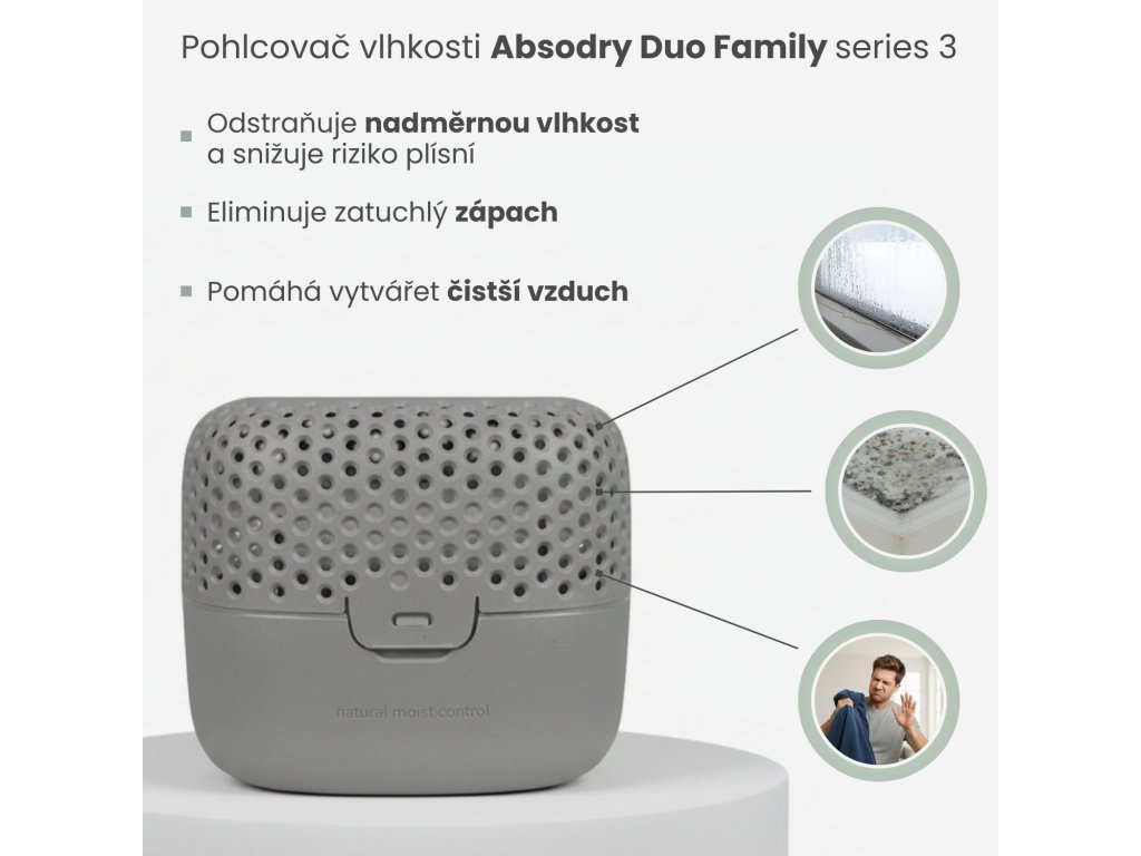 S přebytečnou vlhkostí se nejčastěji setkáváme v koupelně či v kuchyni. Pokud je překročena ideální hladina vlhkosti (40-60 %), hrozí vznik alergie či dýchacích obtíží.Pohlcovač vlhkosti Absodry vás ohromí tím, kolik vzdušné vlhkosti dokáže zachytit během několika dní. Váš domov se tak opět stane bezpečným prostředím pro vás i vaše nejbližší.