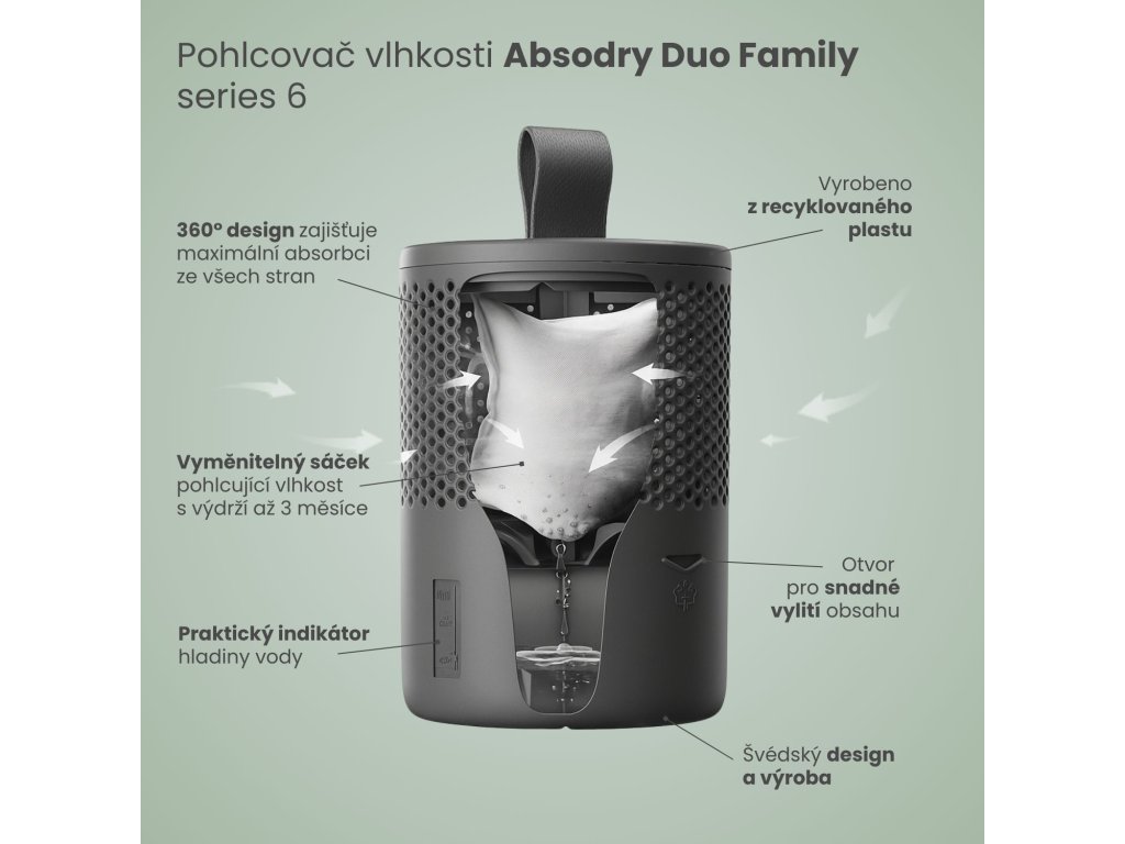 Absodry Duo Family je vyroben z recyklovaného plastu. Švédská společnost Everbrand je moderní firmou se silným enviromentálním přístupem k životnímu prostředí. A pokud zbavíte vaši domácnost vlhkosti a nepříjemných plísní, je to přesně ten stav, který si firma dala jako svůj cíl.