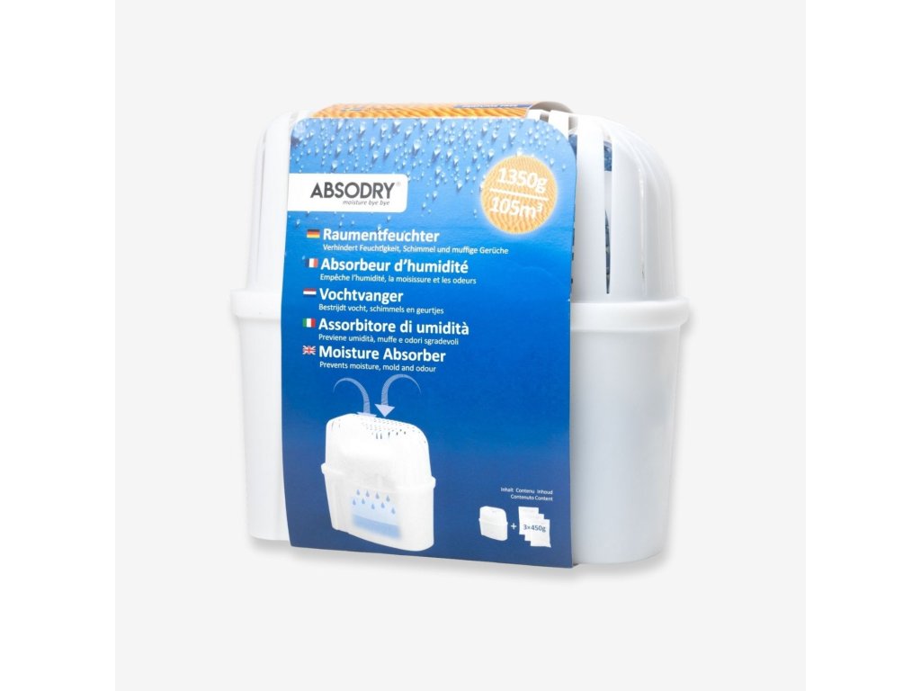 Snižte riziko vzniku plísní a zápachu a zbavte se přebytečné vlhkosti pomocí Absodry Maxi. Tento účinný pohlcovač vlhkosti využívá absorpční krystaly, které kondenzují vlhkost vzduchu a vodu pak sbírají do spodní nádržky. Absodry Maxi nepotřebuje elektřinu a jedna náplň krystalů vydrží až 3 měsíce. Je skvělý do větších místností o velikosti až 105 m3 (zhruba 45 m2). Odvlhčovač Absodry Maxi se dodává se 3 sáčky krystalů navíc.