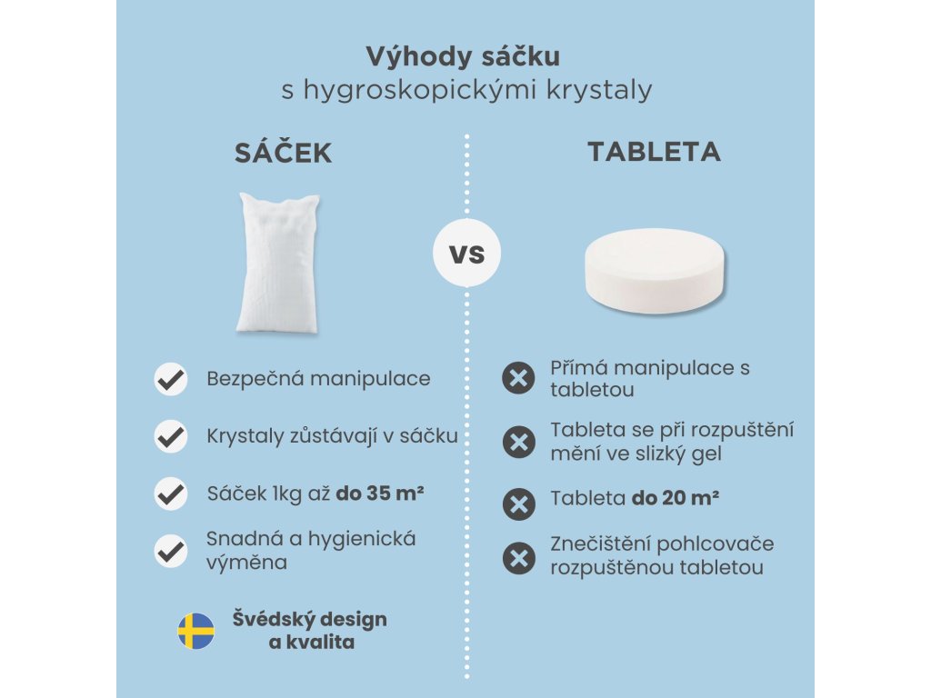 Snižte riziko vzniku plísní a zápachu a zbavte se přebytečné vlhkosti pomocí Absodry Mini Compact. Tento účinný pohlcovač vlhkosti využívá absorpční krystaly, které kondenzují vlhkost vzduchu a vodu pak sbírají do spodní nádržky. Absodry Mini Compact nepotřebuje elektřinu a jedna náplň krystalů vydrží až 3 měsíce. Je skvělý do větších místností o velikosti až 35 m3 (zhruba 35 m2). Odvlhčovač Absodry Big Compact se dodává s jednou náplní - o hmotnosti 450 g.