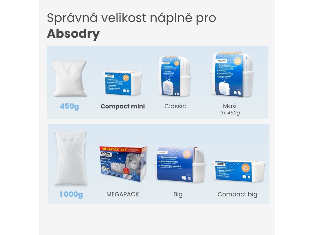 Problémy jako jsou alergie, dýchací obtíže nebo tvorba plísní a zápachu má velmi často na svědomí nadměrná vlhkost v domácnosti. Absorbér vlhkosti Absodry Mini Compact vám ale pomůže udržet optimální úroveň vlhkosti (zhruba mezi 40 a 60 %). Redukuje totiž přebytečnou vlhkost vzduchu pomocí absorpčních krystalů a kondenzuje ji na vodu, která odkapává do sběrné nádržky. Tu po naplnění jednoduše vylijete. Absodry Mini Compact pohlcuje nejen vlhkost, ale i nepříjemný zápach.